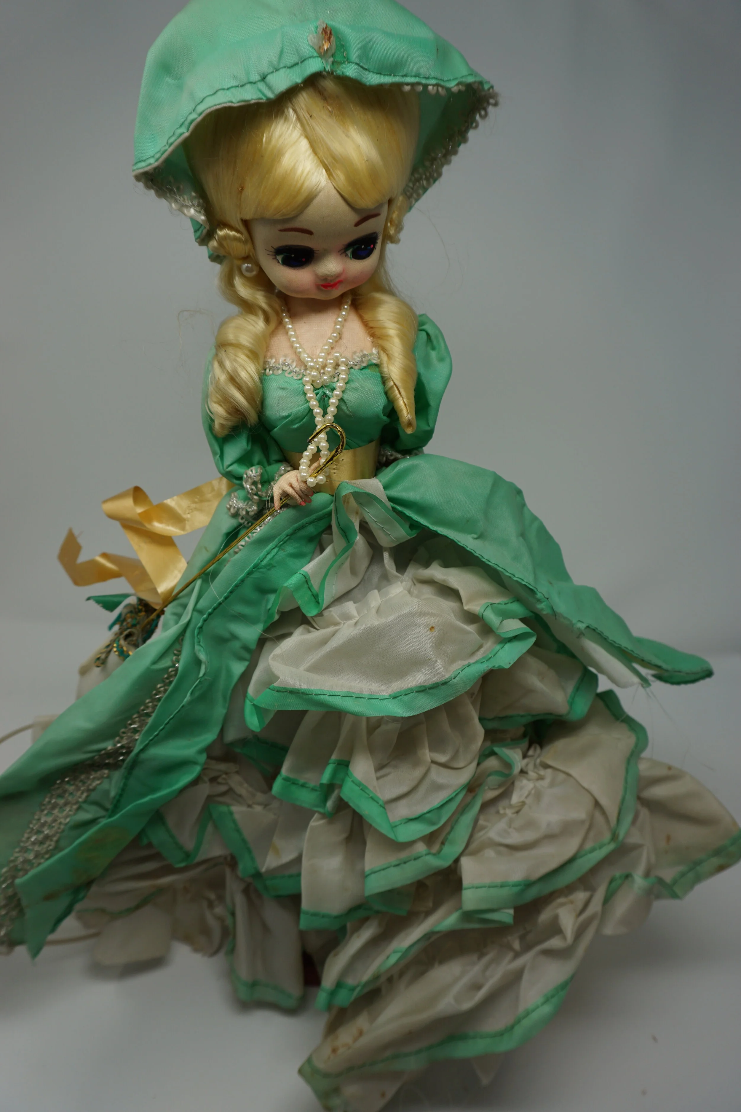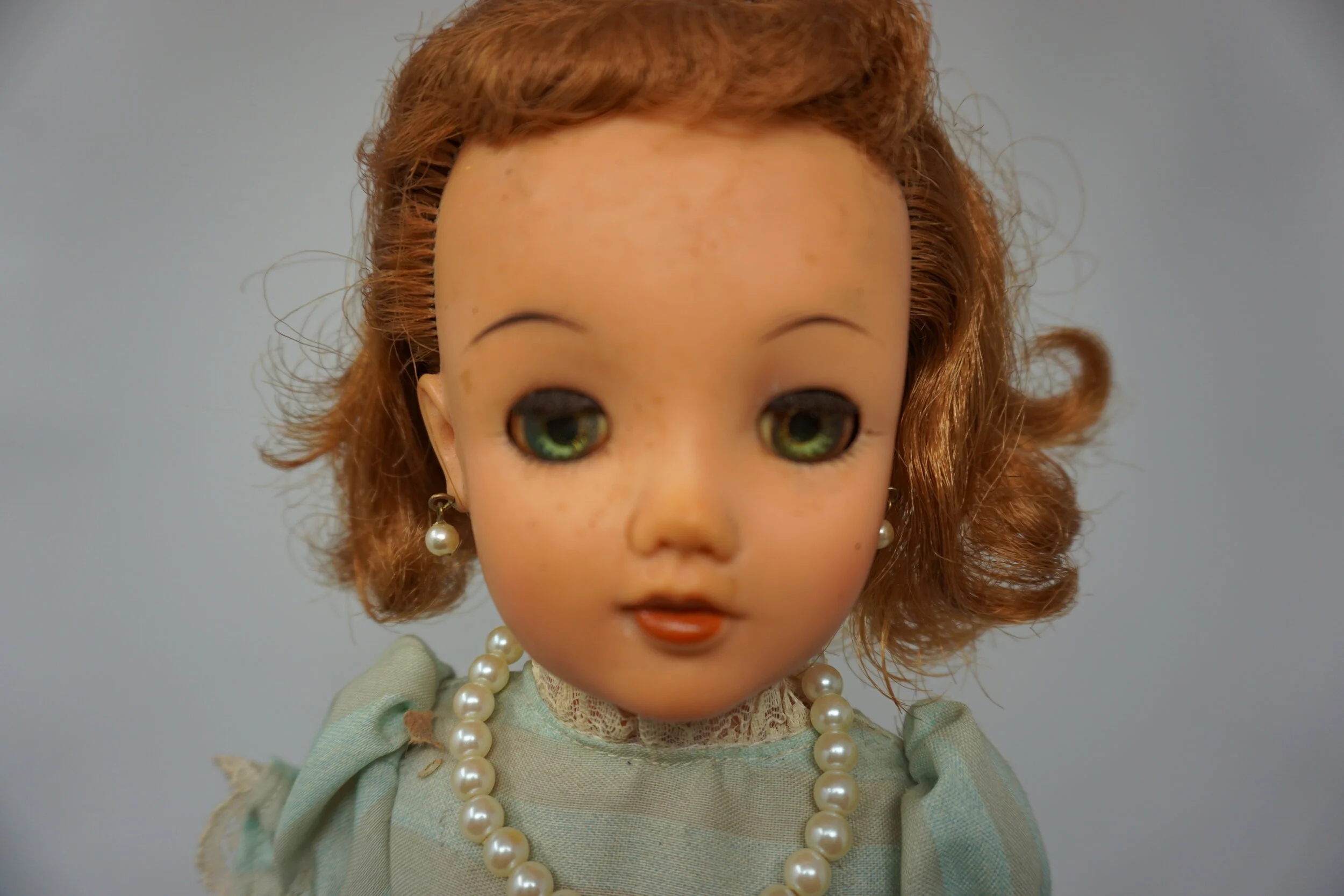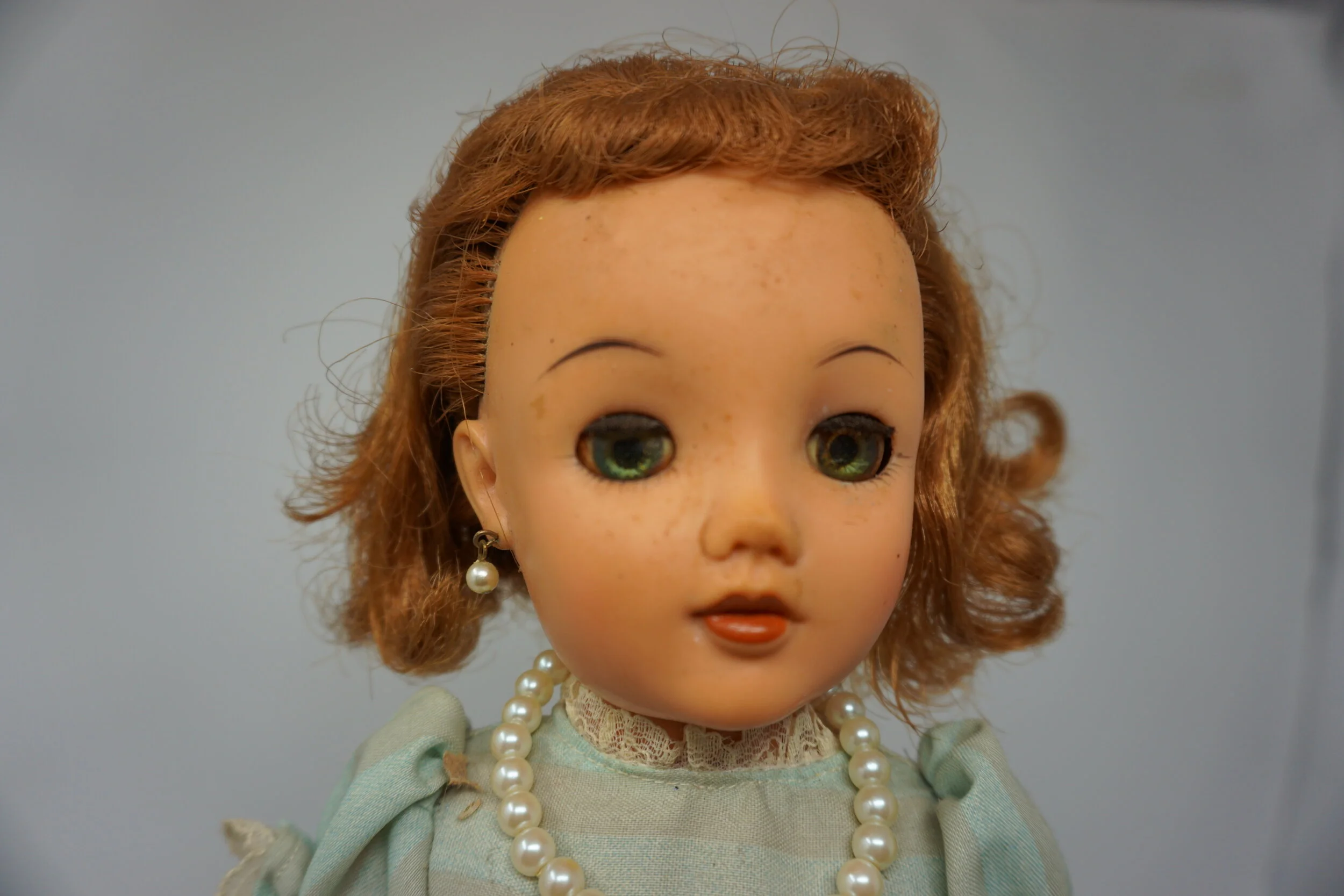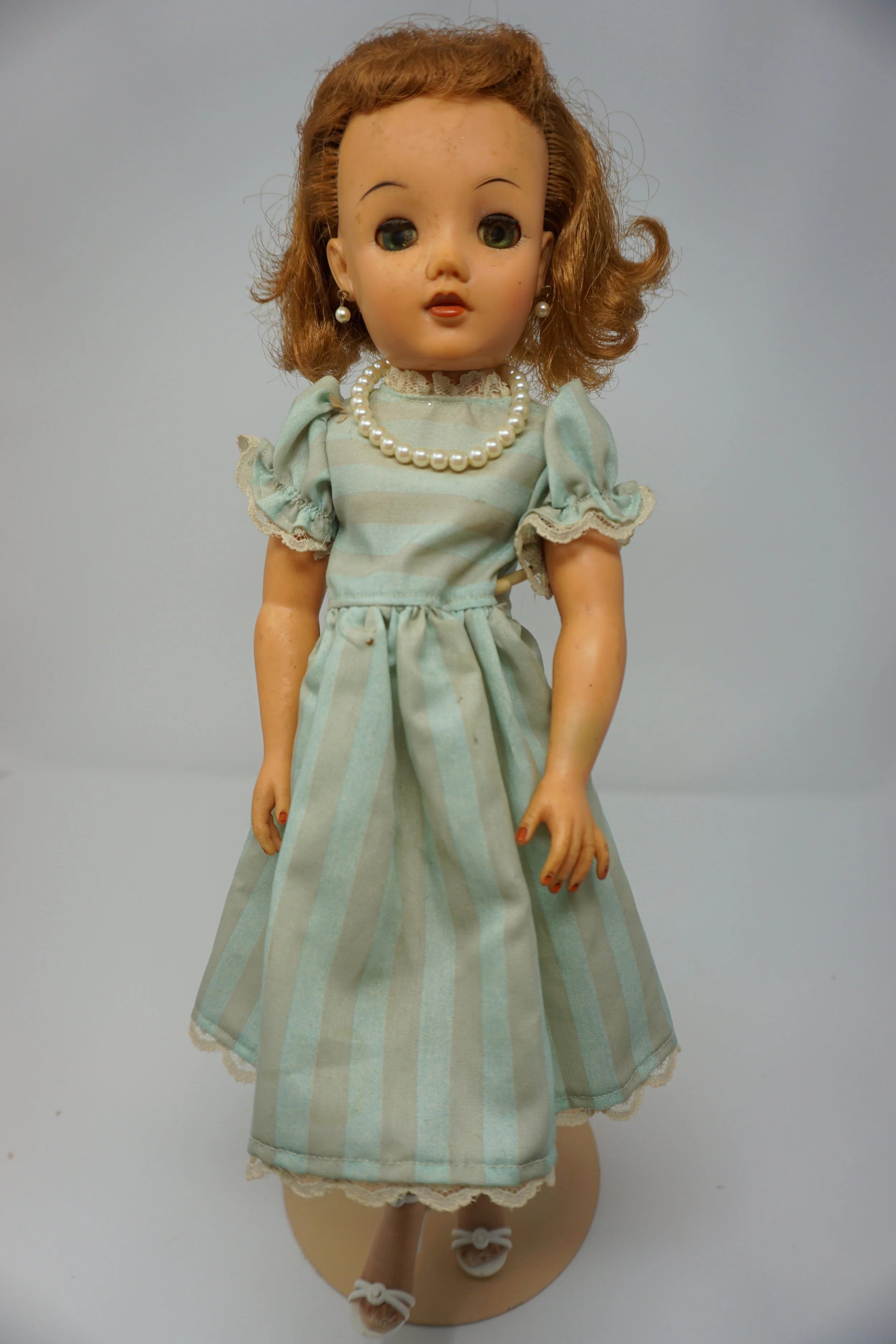 Jillian's light blue striped dress pearl necklace green eyes doll